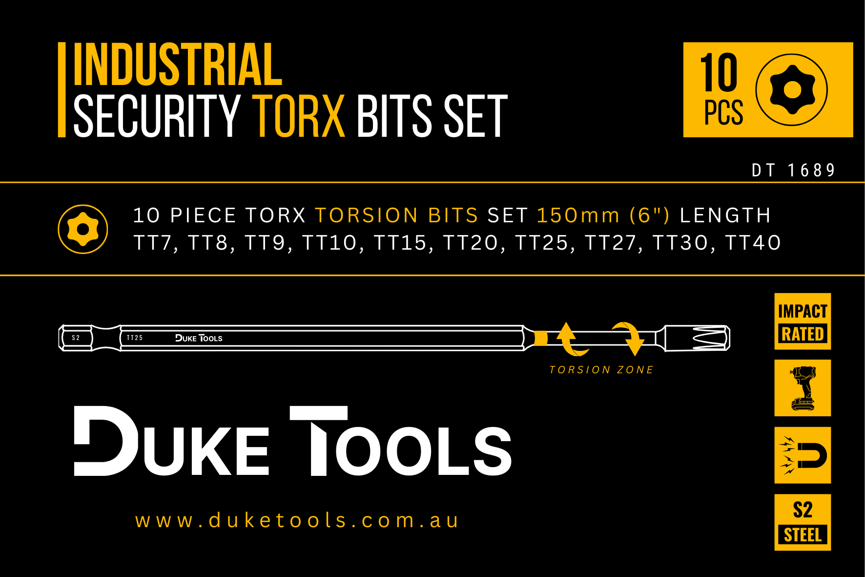 Duke Tools Impact Driver Bit Sets are engineered for high-torque, heavy-duty fastening applications. Made from S2 steel and designed to withstand extreme impact, these bits include Torx, Hex, and Torsion driver sets, as well as extra-long magnetic options for hard-to-reach fasteners.