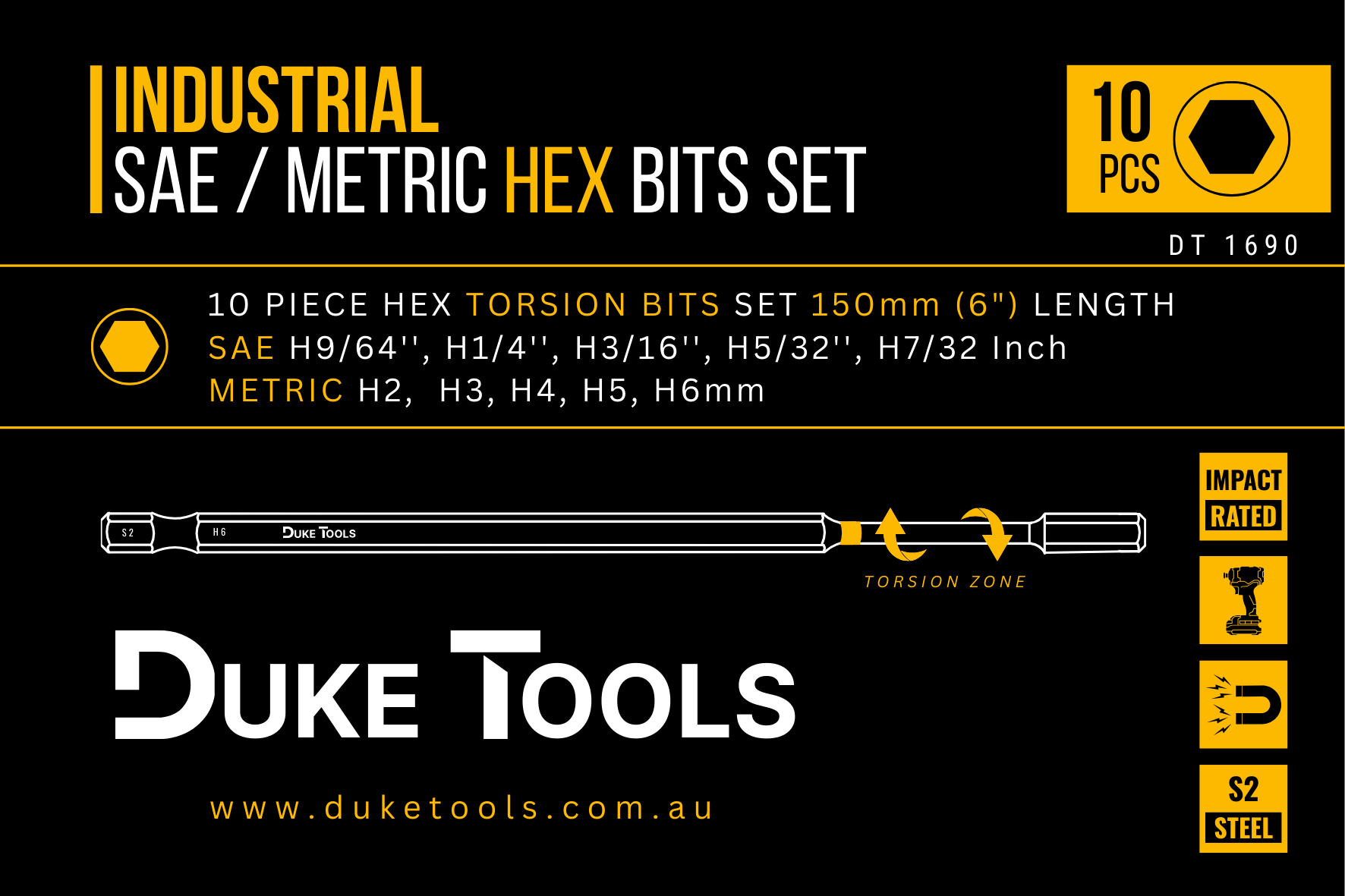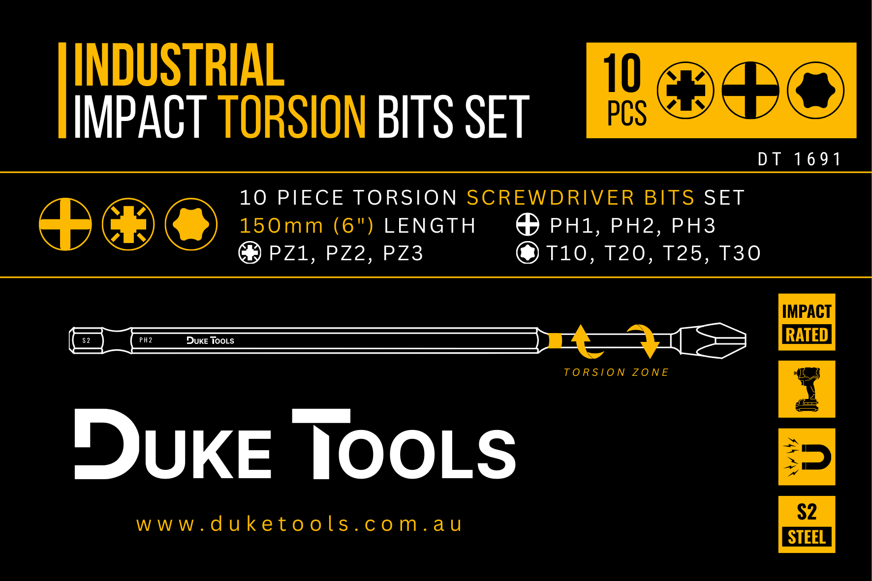 Duke Tools Impact Driver Bit Sets are engineered for high-torque, heavy-duty fastening applications. Made from S2 steel and designed to withstand extreme impact, these bits include Torx, Hex, and Torsion driver sets, as well as extra-long magnetic options for hard-to-reach fasteners.