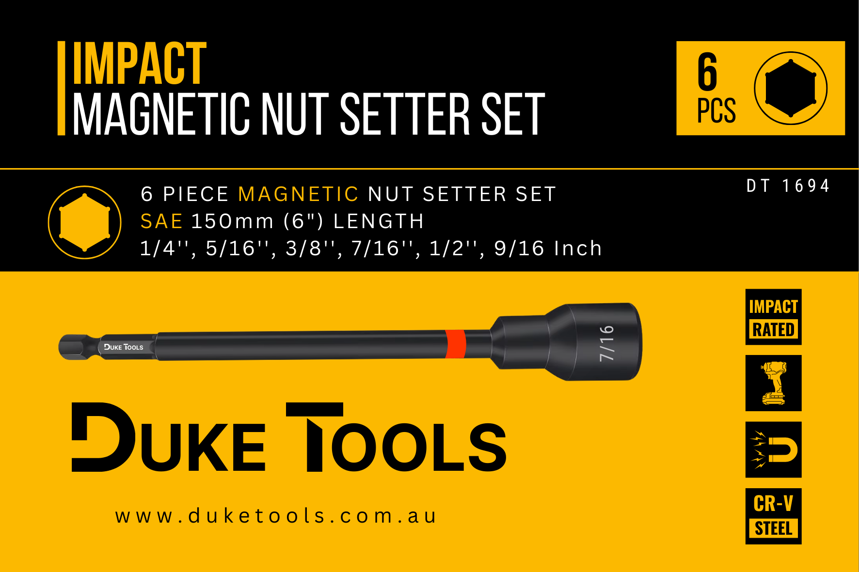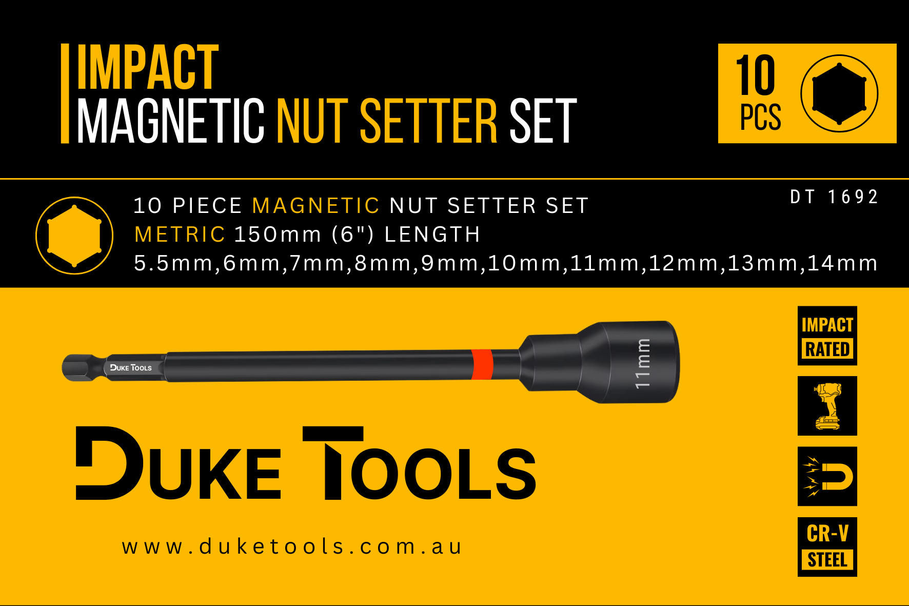 Duke Tools Nut Setter Sets provide fast, secure fastening for both professional and DIY projects. Available in 65mm and 150mm lengths, and in SAE/Imperial and Metric sizes, these nut setters are built with magnetic tips for a secure hold on fasteners.