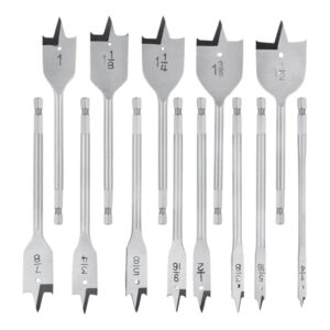 The 13 Piece Spade Bit Set is perfect for your next timber project Specifications: Spade Bit Hex Shank 150mm Length SAE/ Imperial Bits 1/4 “, 5/16″, 3/8″, 1/2″, 9/16″, 5/8″, 3/4″, 7/8″, 1″, 1-1/8″, 1-1/4″, 1-3/8″, 1-1/2”